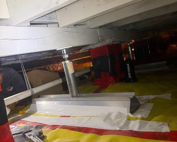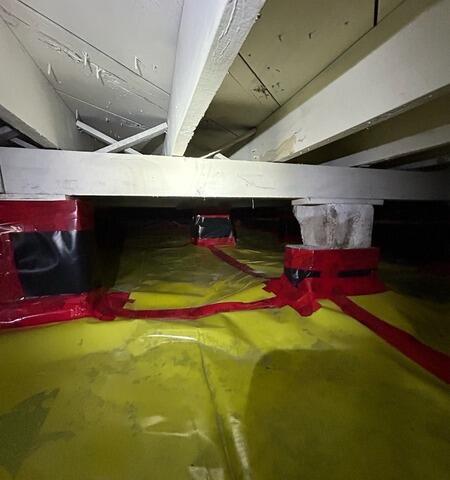 Our team installed a SmartJack support system to restore strength and stability beneath the home. These adjustable steel posts are designed to lift and support sagging floor joists while distributing weight evenly across a secure base. The crawl space was also carefully sealed around the installation to protect against moisture and maintain long-term performance.